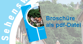 Hier finden Sie unsere Broschüre über die Sehenswürdigkeiten in Weinheim als pdf-Datei (2,4 MB). Auf Wunsch senden wir Ihnen die Broschüre gerne per Post zu. Zur Prospektbestellung gelangen Sie hier.