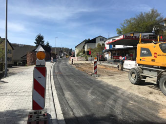 Der Kanalgraben wird, wie bisher, abschnittsweise mittels einer provisorischen Asphaltschicht geschlossen. Voraussichtlich ab Mitte Juli wandert die Kanalbaustelle in den Bildstockweg, um dort noch ca. 50 m Kanal auszutauschen. Dann wird im Bereich der Tankstelle mit den Straßenbauarbeiten unter halbseitiger Sperrung mit Ampelschaltung begonnen.