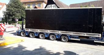 Die drei Teile, darunter das schwerste Teil mit über 40 Tonnen, wurde mittels drei Sondertransporten zur Baustelle transportiert.
