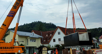 Anfang der übernächsten Woche, voraussichtlich am 28.06.2021 wird das Regenüberlaufbauwerk im Bereich des Ortszentrums angeliefert und mittels Autokran eingehoben. Die Lastzüge und der Autokran werden zur Vermeidung einer Vollsperrung der Großsachsener Straße auf dem Parkplatz gegenüber der Gaststätte "Zur Rose" stehen.