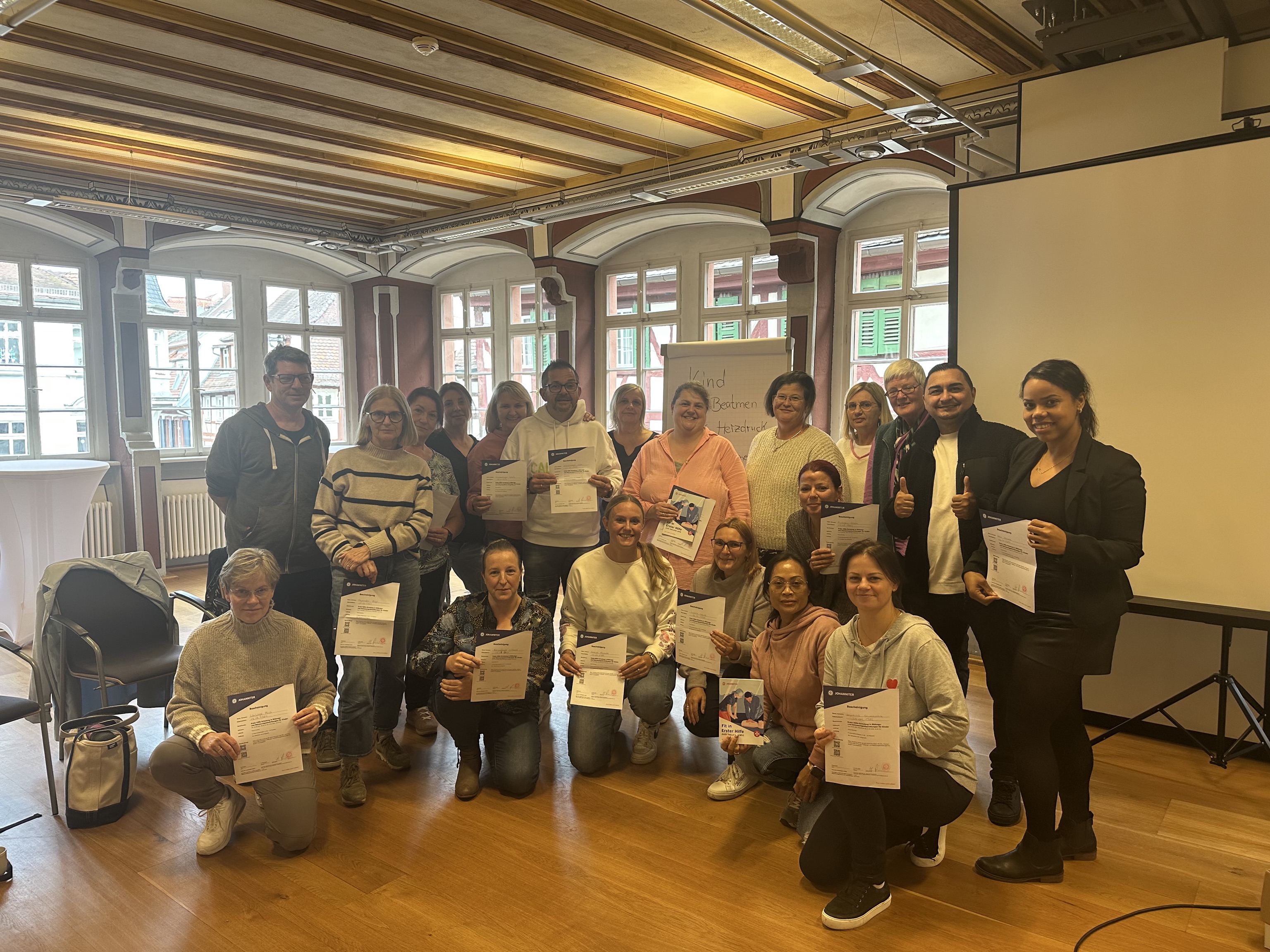 Mit einem gemeinsamen Gruppenfoto endete am Wochenende ein praxisnaher Erste-Hilfe-Kurs für 20 Kindertagespflegepersonen aus Weinheim. Gut gerüstet für den Ernstfall starten sie nun in ihre Arbeitswoche – mit frischem Wissen und gestärktem Vertrauen in die eigenen Fähigkeiten.