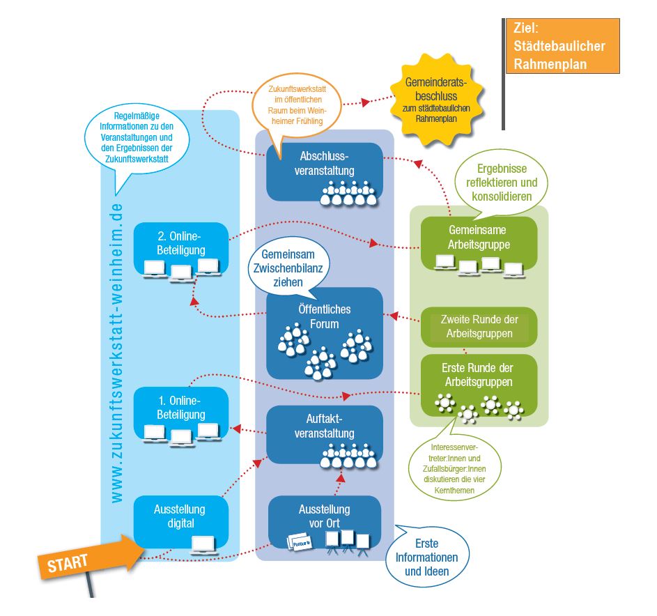 Die Zukunftswerkstatt war ein rund zweijähriger intensiver Dialogprozess, der im September 2021 gestartet wurde und vielfältige Beteiligungsmöglichkeiten in stadtweiten Diskussionsforen, konzentrierten Arbeitstreffen und Onlinedialogen geboten hat. Der Prozess wurde von einem großen Engagement der Beteiligten - insbesondere in den Arbeitsgruppen - getragen. Das Ziel dieses Prozesses war der vertiefte Dialog zu Zielen und Maßnahmen des Rahmenplans. Die Ideen und Anregungen der Bürger:Innen und der Akteur:Innen Weinheims wurden von den Planenden im Sinne eines agilen Prozesses aufgegriffen, fachlich angereichert und im Dialog gemeinsam weiterentwickelt. Der städtebauliche Rahmenplan fasst die Ergebnisse zusammen und enthält somit die Fokusthemen und Schwerpunktsetzungen aus dem Prozess.